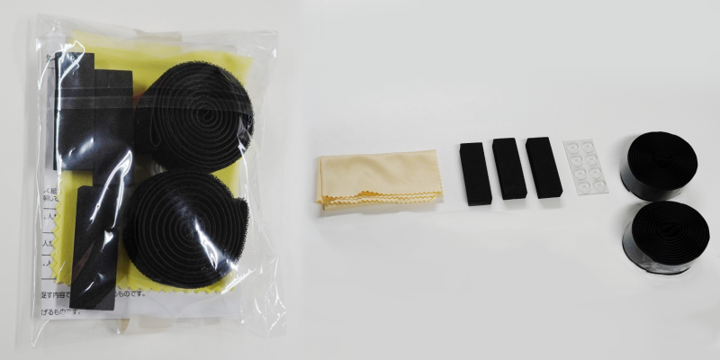 ベルト×2本、スペーサー×3個、透明上部折り曲げ部滑り止め用パッド、クリーニングクロス