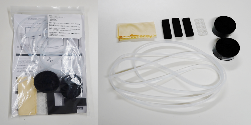 ベルト×2本、スペーサー×3個、透明上部折り曲げ部滑り止め用パッド、クリーニングクロス、エッジカバー