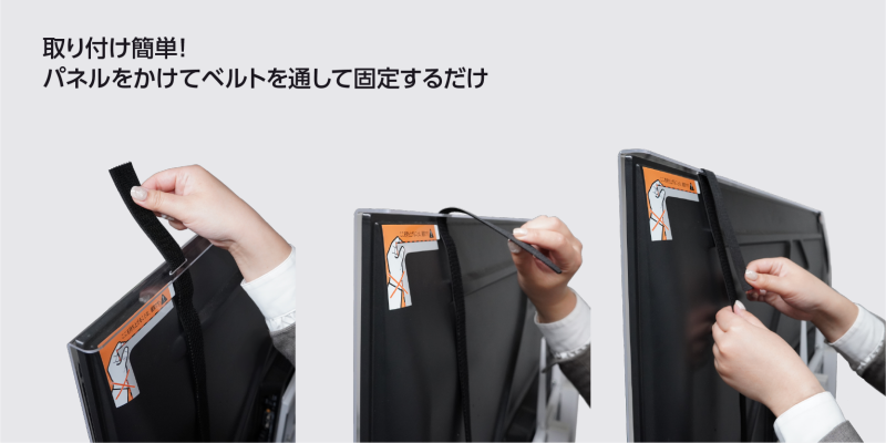 パネルをディスプレイ上部にひっかけて、マジックテープのベルトを通して背面で固定するだけで取り付けが可能です。