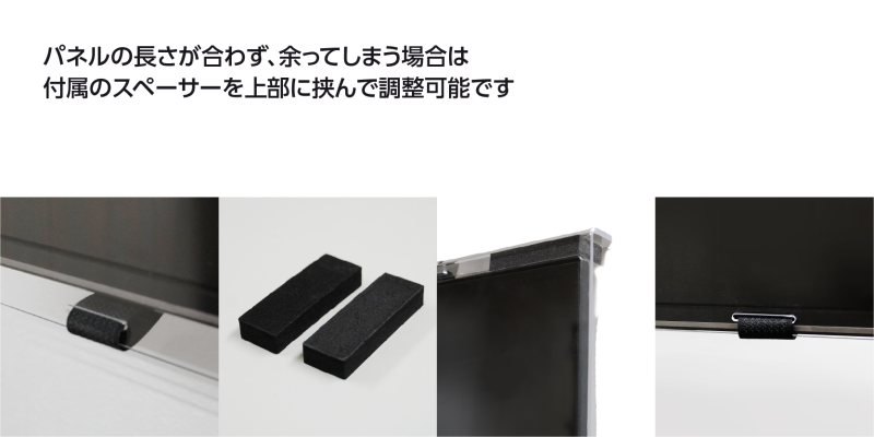 ディスプレイ下部にパネルが余ってはみ出してしまう場合、付属のスペーサーを挟んで調整が可能です。